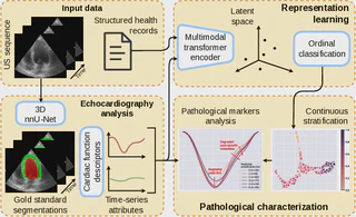 Deep learning enables automatic and robust extraction of cardiac function descriptors from echocardiographic sequences, such as ejection fraction (EF) or strain. These descriptors provide fine-grained information that physicians consider, in conjunction with more global variables from the clinical record, to assess patients’ condition. Drawing on novel Transformer models applied to tabular data, we propose a method that considers all descriptors extracted from medical records and echocardiograms to learn the representation of a cardiovascular pathology with a difficult-to-characterize continuum, namely hypertension. Our method first projects each variable into its own representation space using modality-specific approaches. These standardized representations of multimodal data are then fed to a Transformer encoder, which learns to merge them into a comprehensive representation of the patient through the task of predicting a clinical rating. This stratification task is formulated as an ordinal classification to enforce a pathological continuum in the representation space. We observe the major trends along this continuum on a cohort of 239 hypertensive patients, providing unprecedented details in the description of hypertension’s impact on various cardiac function descriptors. Our analysis shows that: 1) the XTab foundation model’s architecture allows to reach high performance (96.8% AUROC) even with limited data (less than 200 training samples); 2) stratification across the population is reproducible between trainings [within 5.7% of mean absolute error (MAE)]; and 3) patterns emerge in descriptors, some of which align with established physiological knowledge about hypertension, while others could pave the way for a more comprehensive understanding of this pathology. The code is available at https://github.com/creatis-myriad/didactic